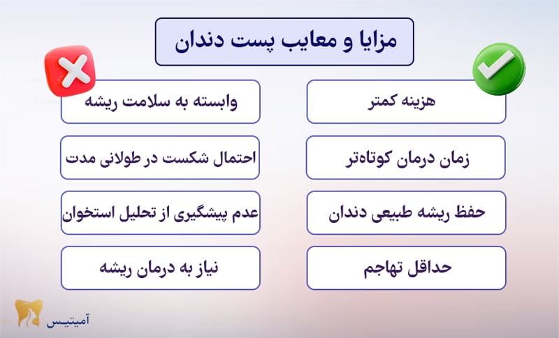 برخلاف ایمپلنت، به استخوان فک متصل نمیشود و در حفظ تراکم استخوان نقشی ندارد. در صورتی که دندان درمانشده با پست در نهایت کشیده شود، استخوان ناحیه بهمرور تحلیل میرود و برای جایگزینی بعدی با ایمپلنت ممکن است نیاز به پیوند استخوان (bone graft) باشد. همچنین اگر لثه اطراف بهخوبی از پست و روکش مراقبت نشود، امکان بروز التهاب و عفونت وجود دارد.
