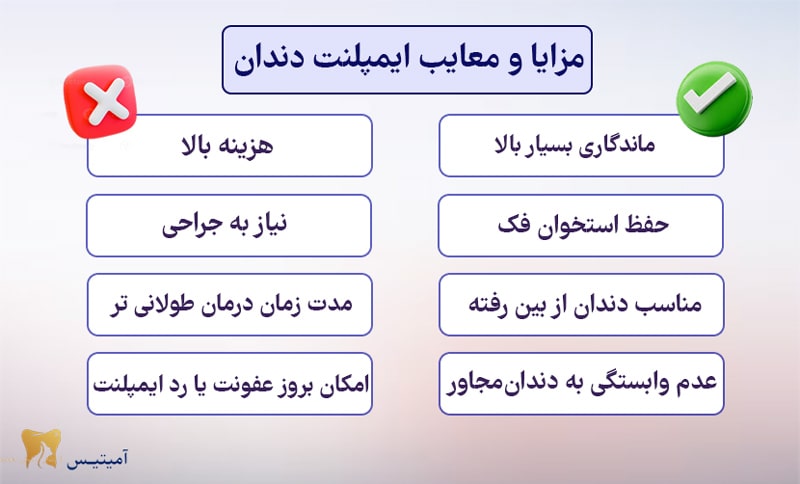 نیز با وجود نرخ موفقیت بالا، خالی از عوارض نیست. در صورت انتخاب نامناسب بیمار (مثلاً افراد با دیابت کنترلنشده، یا استخوان ضعیف)، یا در صورتی که جراحی با خطا همراه باشد، ممکن است عوارضی مانند عفونت، التهاب لثه اطراف ایمپلنت (Peri-implantitis)، یا حتی پسزده شدن ایمپلنت توسط بدن اتفاق بیفتد. با این حال، این مشکلات با برنامهریزی دقیق درمانی و پیگیری مناسب، قابل پیشگیری یا کنترل هستند.